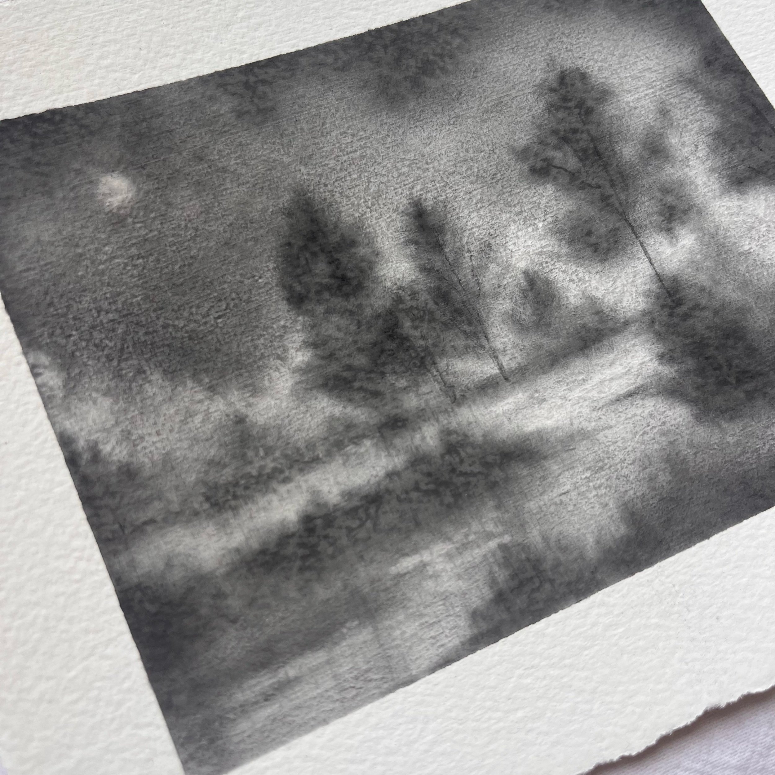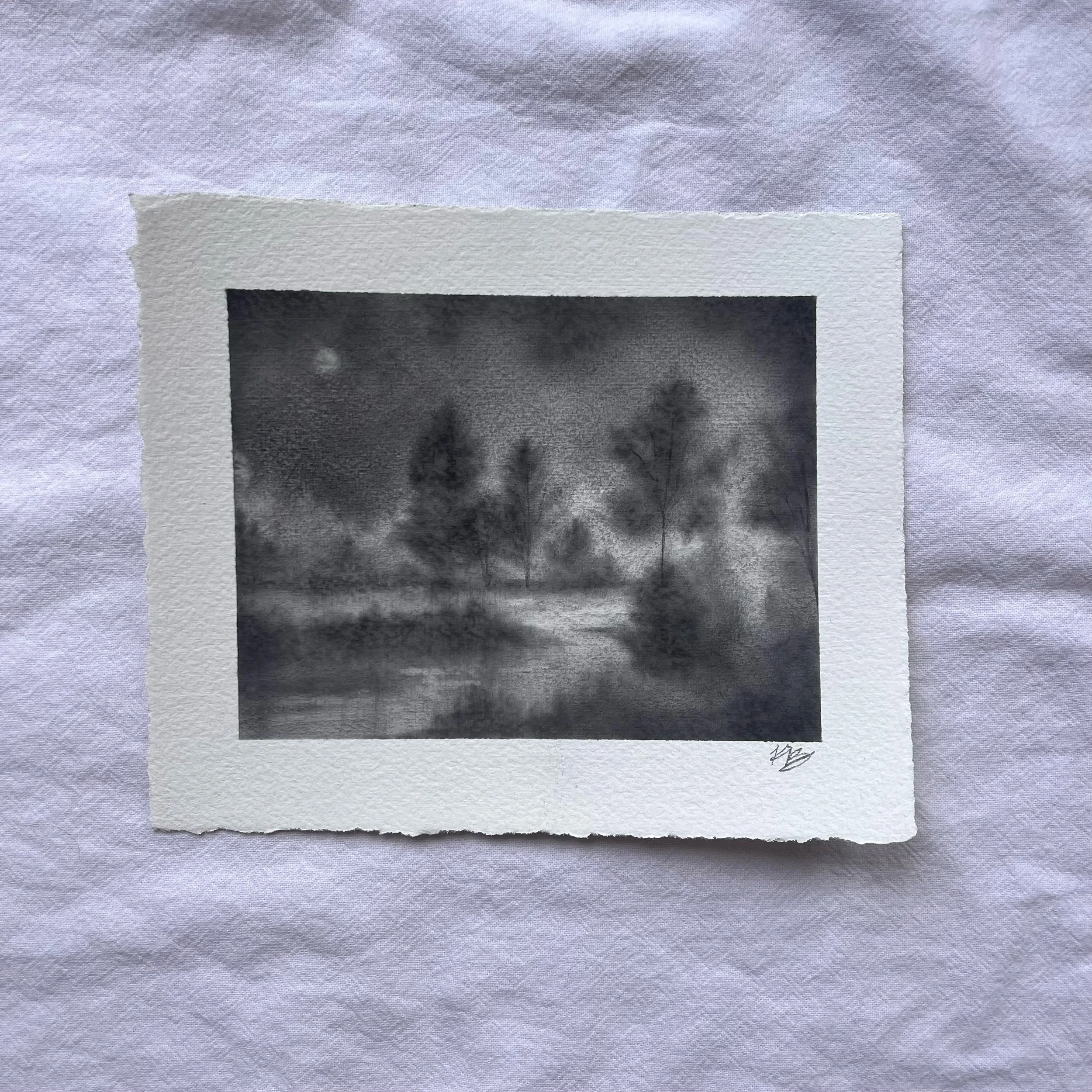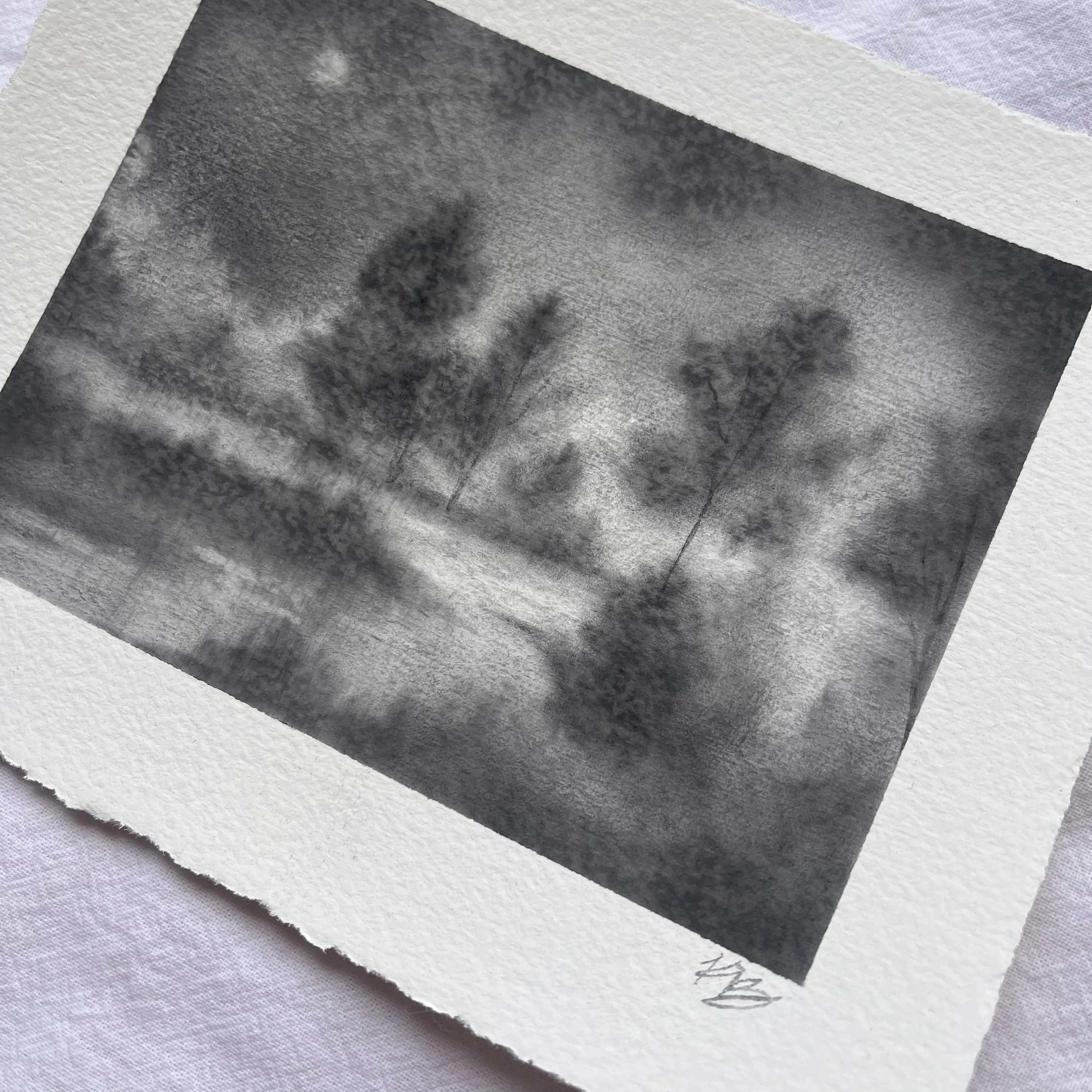 Original charcoal landscape on Strathmore watercolor paper with deckled edge. Borders measure approximately 6” x 5” and art measures approximately 4.75” x 3.75”. Coated with fixative for preservation. Slight variance in size may occur due to hand-torn paper. Signed on front with title on reverse.