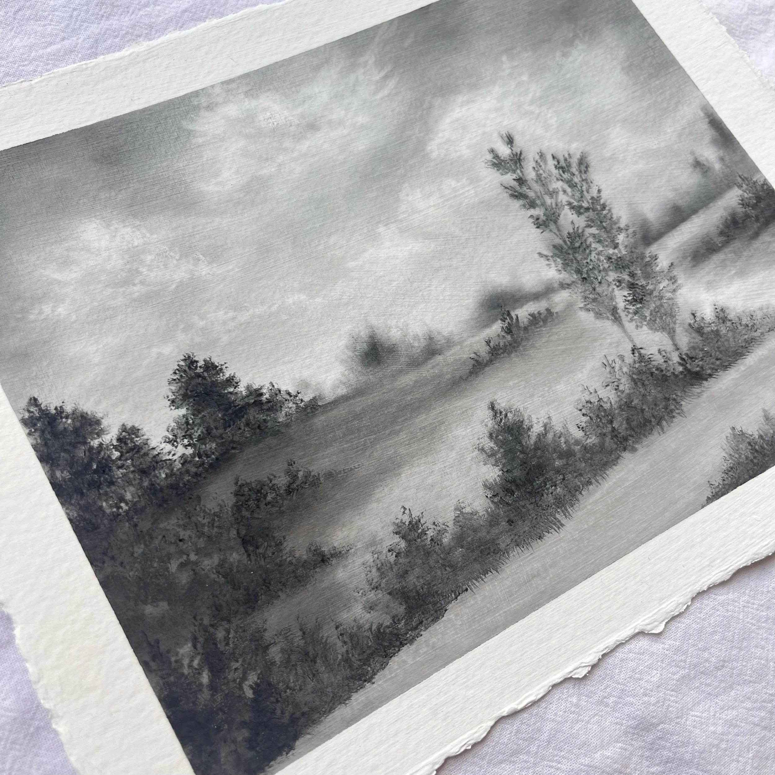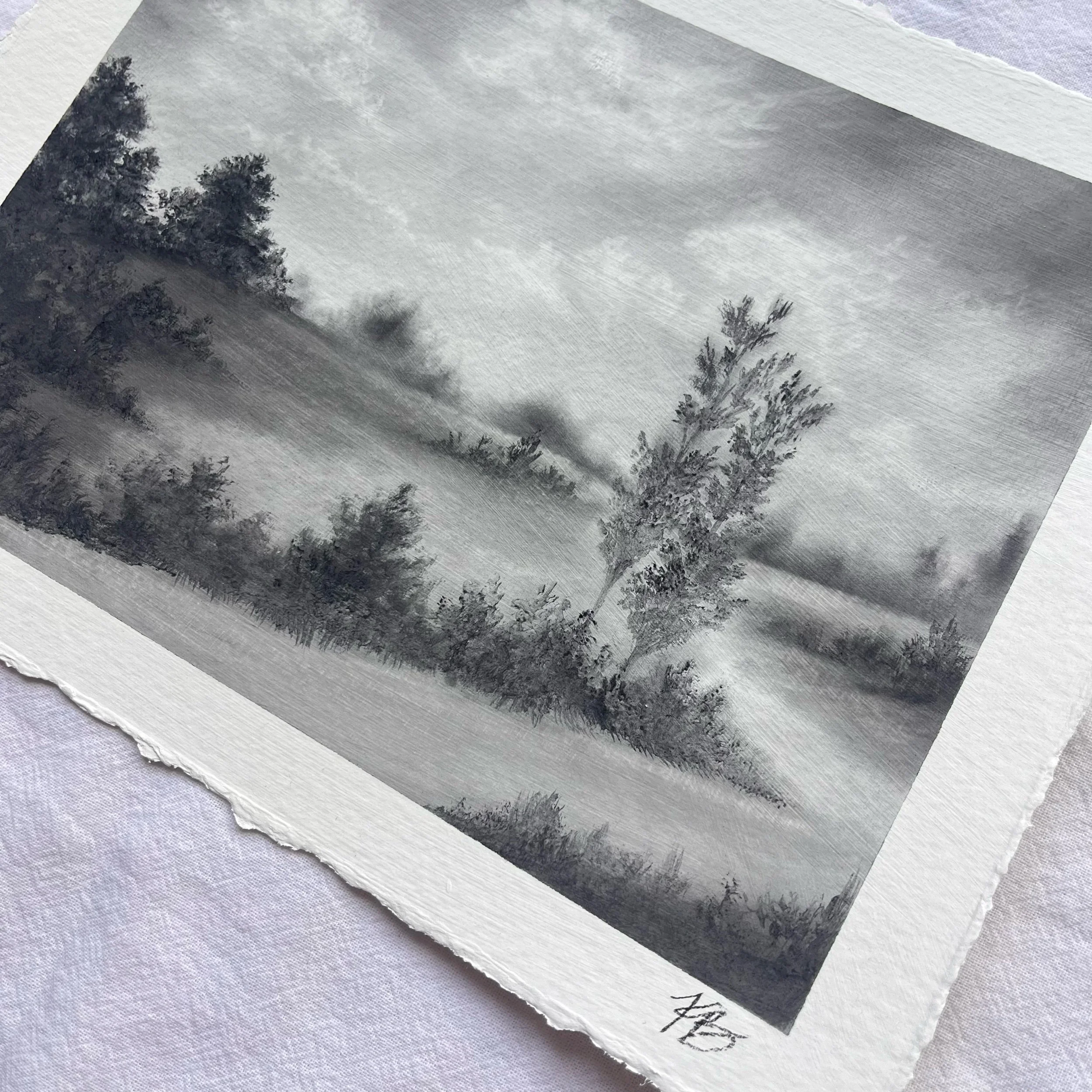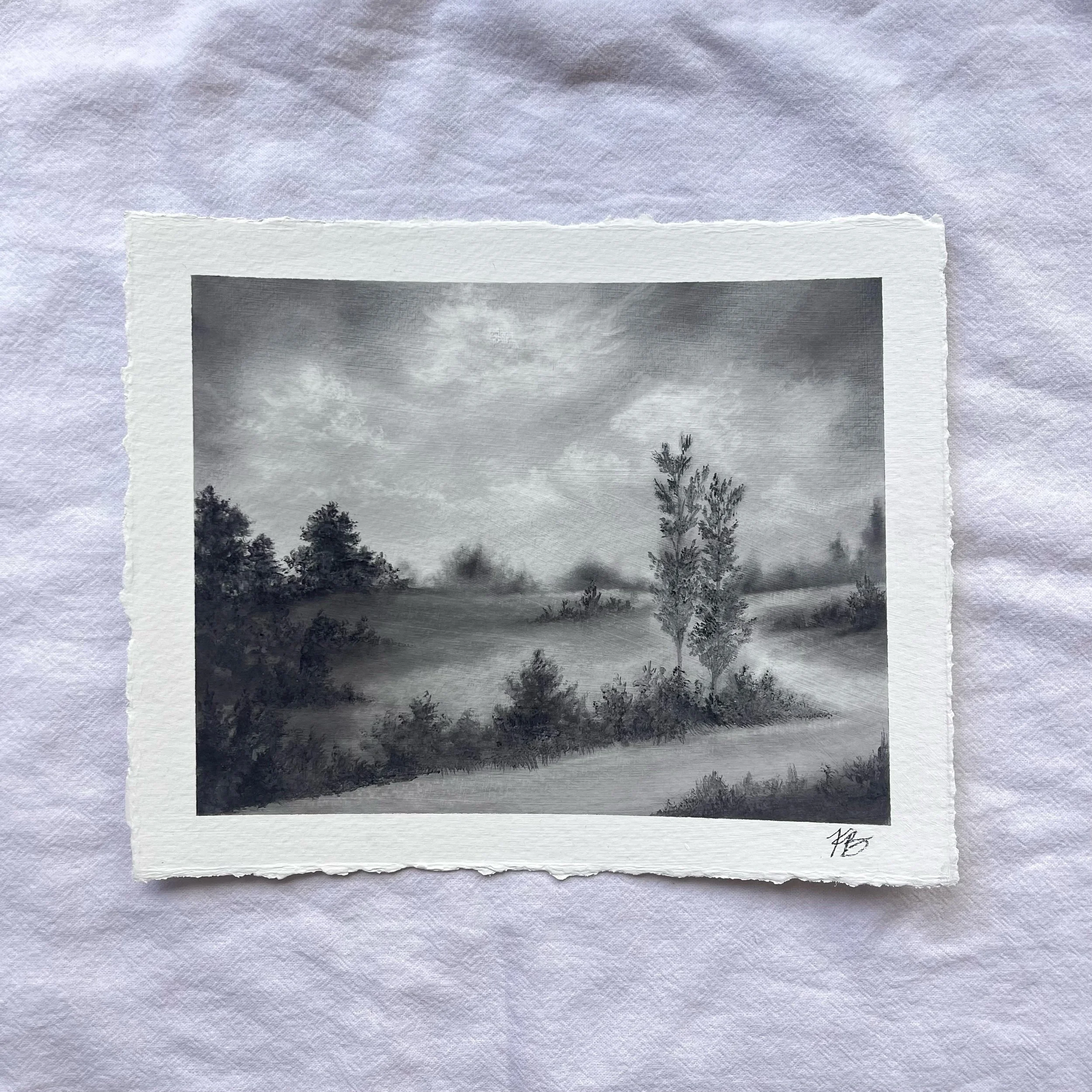 Original charcoal landscape on Strathmore watercolor paper with deckled edge. Borders measure approximately 6.5” x 8” and art measures approximately 5.25” x 6.75”. Coated with fixative for preservation. Slight variance in size may occur due to hand-torn paper. Signed on front with title on reverse.